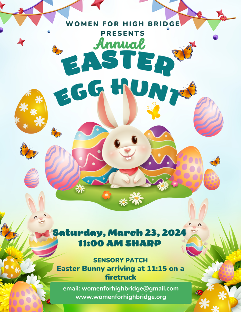 Women for High Bridge volunteers are excited to present this family favorite! Meet the Easter Bunny who will be arriving via a High Bridge Fire Department firetruck. Visit and have your picture taken with the Easter bunny. Prizes for all age groups! We are pleased to once again offer our Sensory Patch for those children who need a less hurried Hunt for Easter eggs. As always, all of our events are inclusive to everyone. This is a rain or shine event this year and we are expecting nothing but sunny skies and lots of happy children. We can’t wait to see you there!