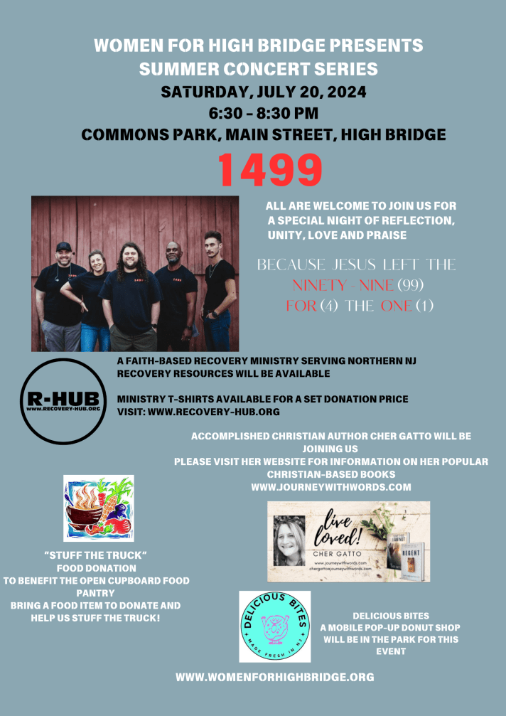 We are excited to have you join us for an evening of Reflection, Unity and Praise with local Christian Band 1499. They are the official band of R-HUB, a non-profit recovery ministry that serves Northern New Jersey. Recovery resources will be available as well as ministry T-Shirts for a set donation price. Accomplished Christian Author, Cher Gatto will also be joining us. You can visit her website: http://www.journeywithwords.com for more information on her books.