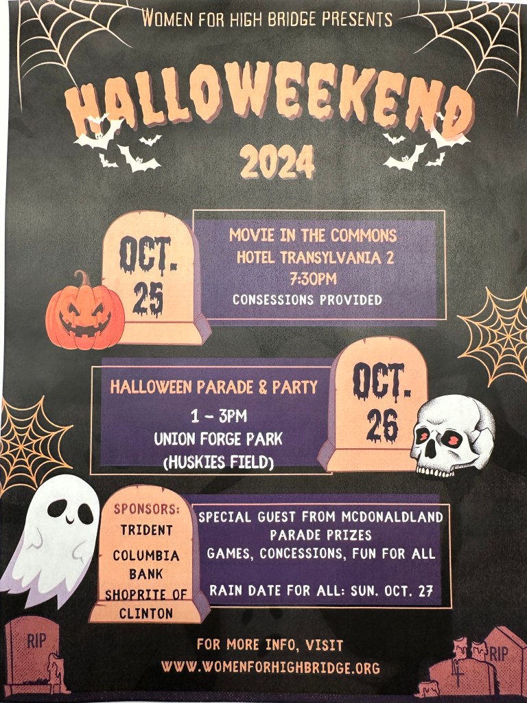 Join us for a weekend of Halloween activities and fun! This is a community favorite for kids and adults. Kicking off the weekend, we have our Movie in the Commons Friday evening, where we will be showing Hotel Transylvania 2 at 7:30 (7:45 start time to allow for attendees from PTO Trunk or Treat to arrive). Bring your lawn chairs and blankets. Be sure to grab some concessions that will be provided. You can always count on free popcorn provided by our Women for High Bridge volunteers! Saturday from 1-3pm at Union Forge Park (Huskies side), we will hold our Halloween Parade. Start working on your costumes now! Prizes awarded in various categories. You may even see a special guest visiting us from McDonaldland. Grimace will be visiting us and he’s looking forward to seeing you! Visit with him and have your picture taken with him. He will be there for 1 hour starting at 1:00PM! {A special thank you to McDonalds of Hunterdon County} It is at this time we will announce the winner of our House Decorating Contest (details and flyer coming soon!), AND the Scarecrow Decorating Contest. Then it’s time to start the party! Stick around and make your way to the various games provided by and run by Women for High Bridge Volunteers, Recreation Committee, Historical Committee and others. Mummy Wrap Race, Find the Eyeball in the Haystack, Halloween Bingo, Cornhole, Sack Races, Pumpkin Bowling, and many more! Halloweekend is guaranteed to be a family fun event! If you would like to volunteer to run a game or help with concessions, please send an email to: womenforhighbridge@gmail.com.