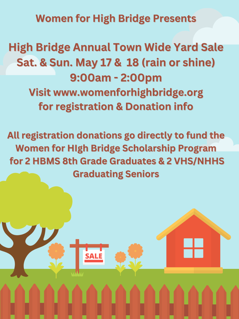 Every year, on the weekend before Memorial Day, Woman for High Bridge holds a two-day Yard Sale event. This serves as a fundraiser for our Scholarships to High School Seniors and HBMS 8th Graders. The Registration Fee for this event is: $7 – 1 day and $14 – 2 days. If you do not wish to participate in the yard sale, but want to make a donation, you can do so through our GiveButter fundraiser link: https://givebutter.com/bYQdGx