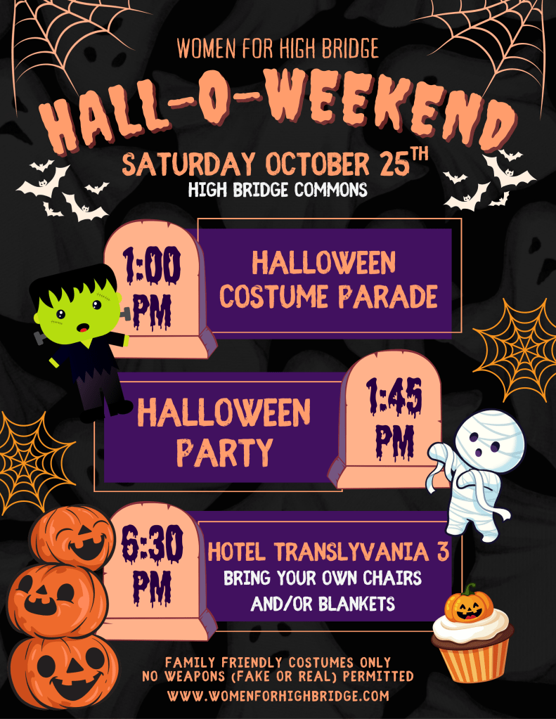 Women for High Bridge is thrilled to host our annual Hall-O-Weekend β a community-favorite event filled with costumes, laughter, and spooky surprises for the whole family.