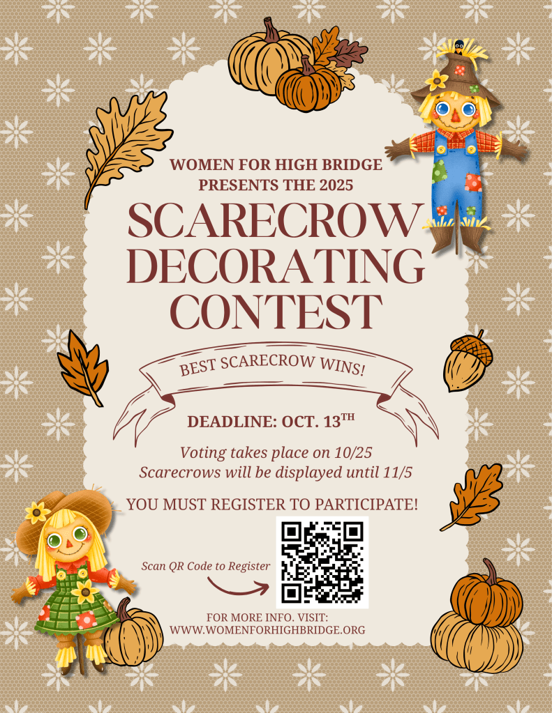 Women for High Bridge is excited to announce the return of our Scarecrow Decorating Contest! Gather your creativity, your family, or your organization, and join us in filling High Bridge with festive fall fun. 🌾🍂