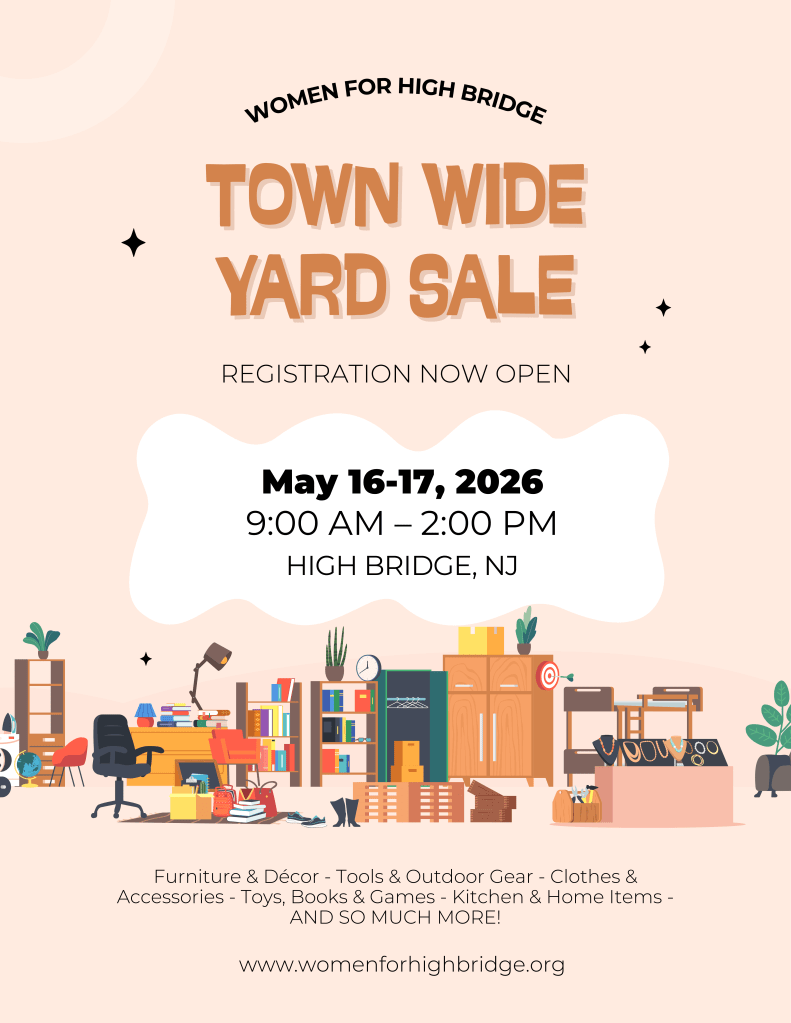 Women for High Bridge is pleased to once again sponsor High Bridge’s Town Wide Yard Sale for 2026! As in the past, the registration fee will go towards a scholarship fund awarded to two High Bridge 8th Graders and two High Bridge Seniors.